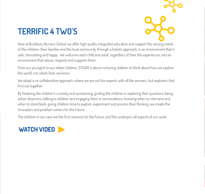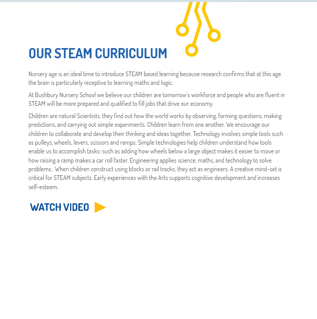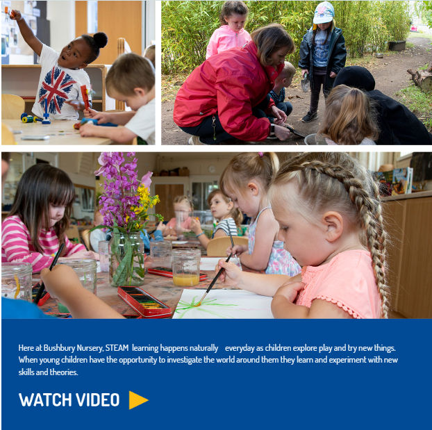 Here at Bushbury Nursery, we are striving to nurture Scientists, Technicians , Engineers, Artists and Mathematicians for the future by offering a holistic STEAM curriculum